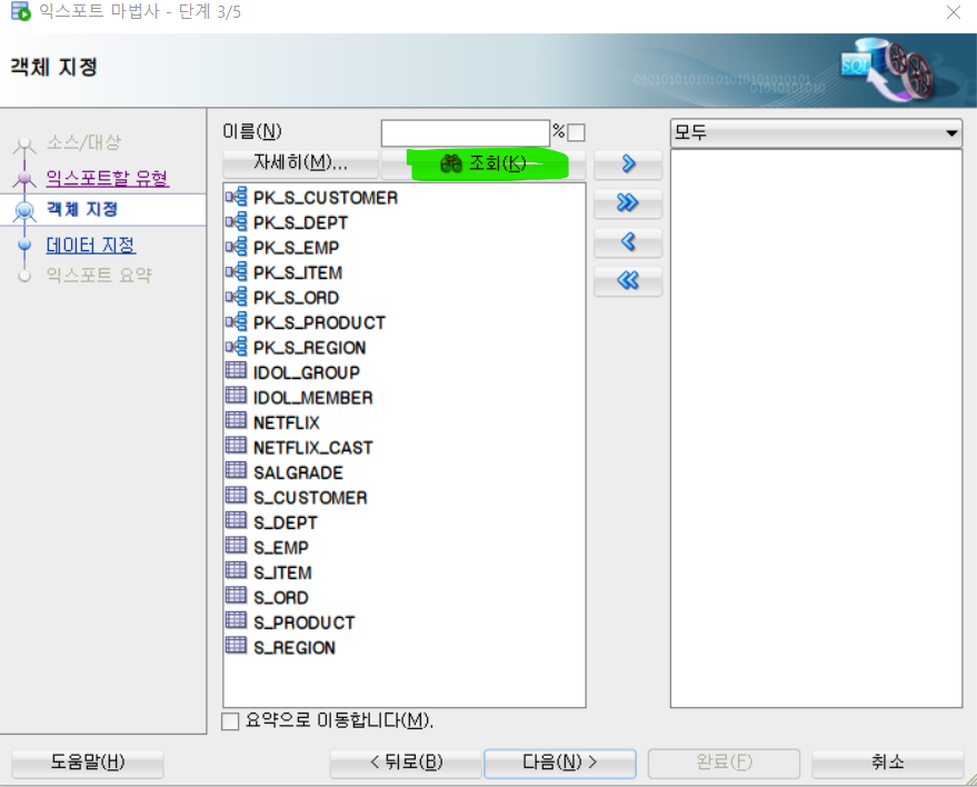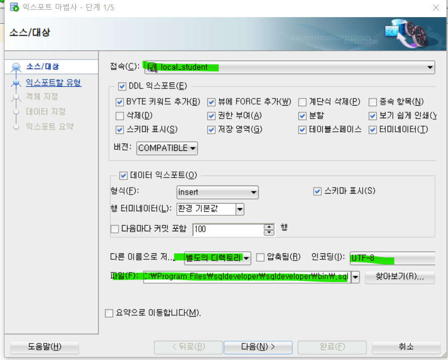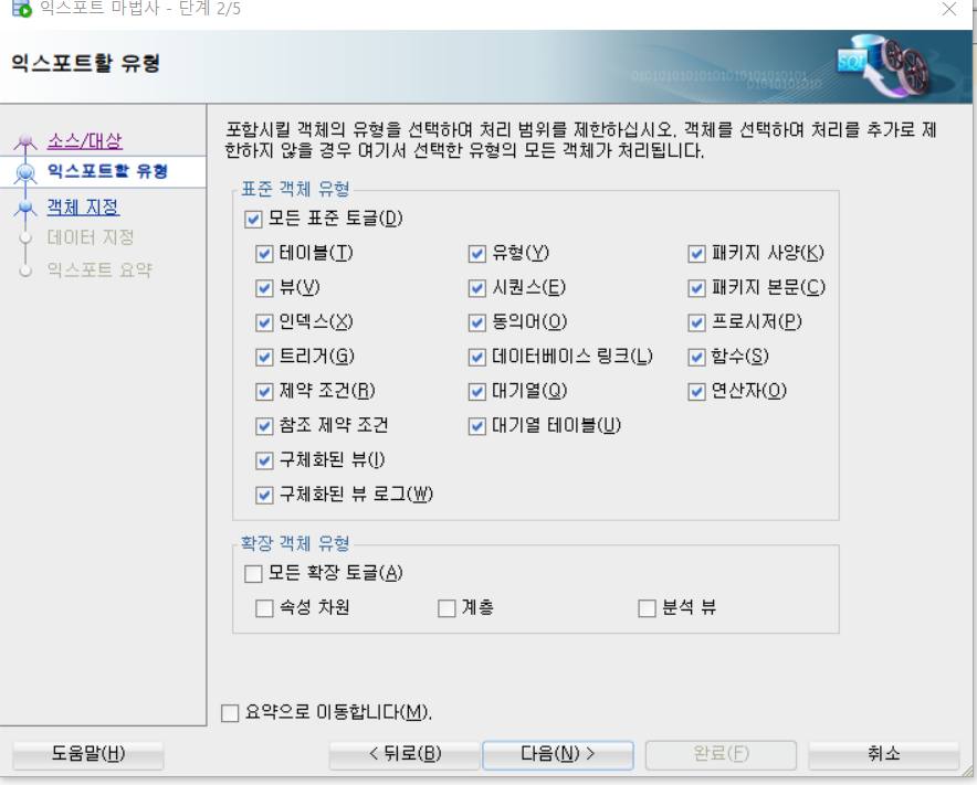 2. 접속할 DB Connection 선택 , 익스포트할 항목 선택 (기본적으로 삭제외에 모두 선택되어있음.)