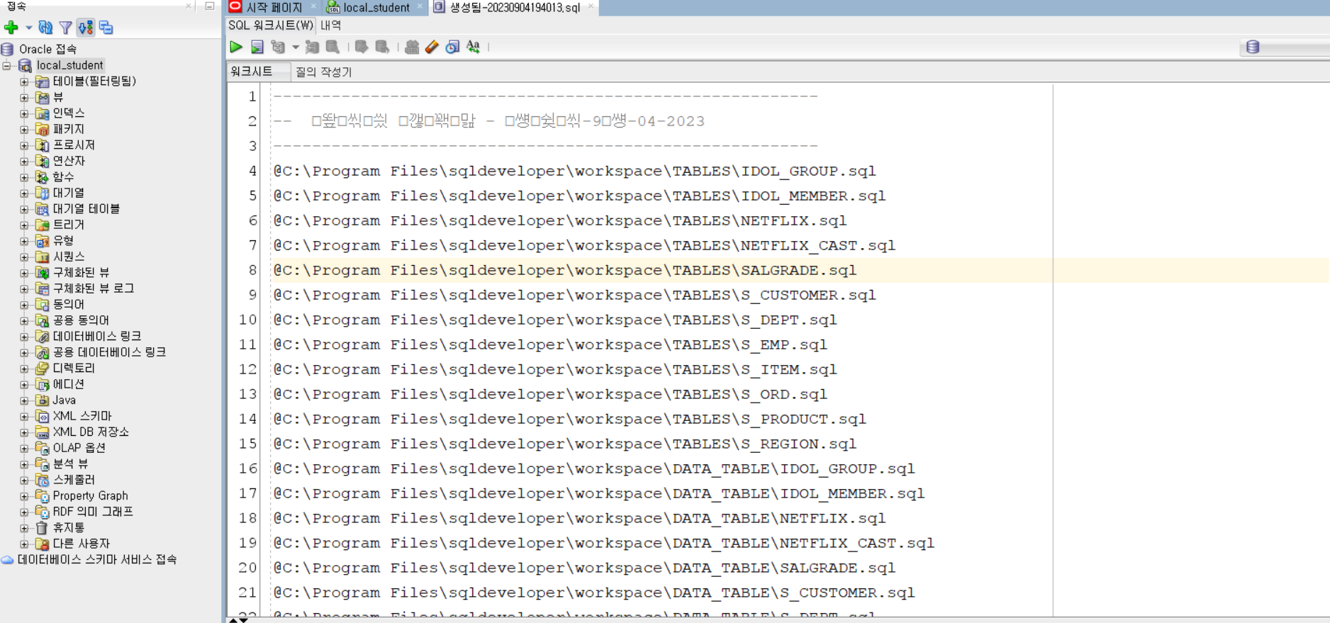 테이블 생성, 데이터 생성 , 시퀀스 생성 등 기능별로 디렉토리를 분리하여 sql문을 덤프한다.