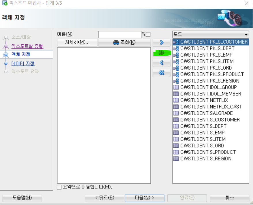 그후 >> 버튼을 누르게 되면 덤프할 내용이 우측으로 이동된다