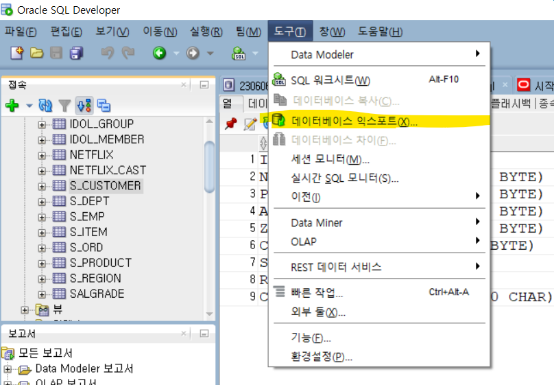 1. 상단 메뉴 - 도구 - 데이터베이스 익스포트