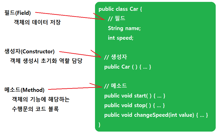 - ν΄λμ€λ κ°μ²΄λ₯Ό μμ±νκΈ° μν νλμ λ©μλ, μμ±μλ‘ κ΅¬μ±λμ΄ μλ€.