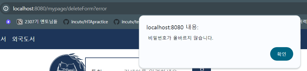 return "redirect:/mypage/deleteForm?error"; // 비밀번호 오류 페이지로 리다이렉트